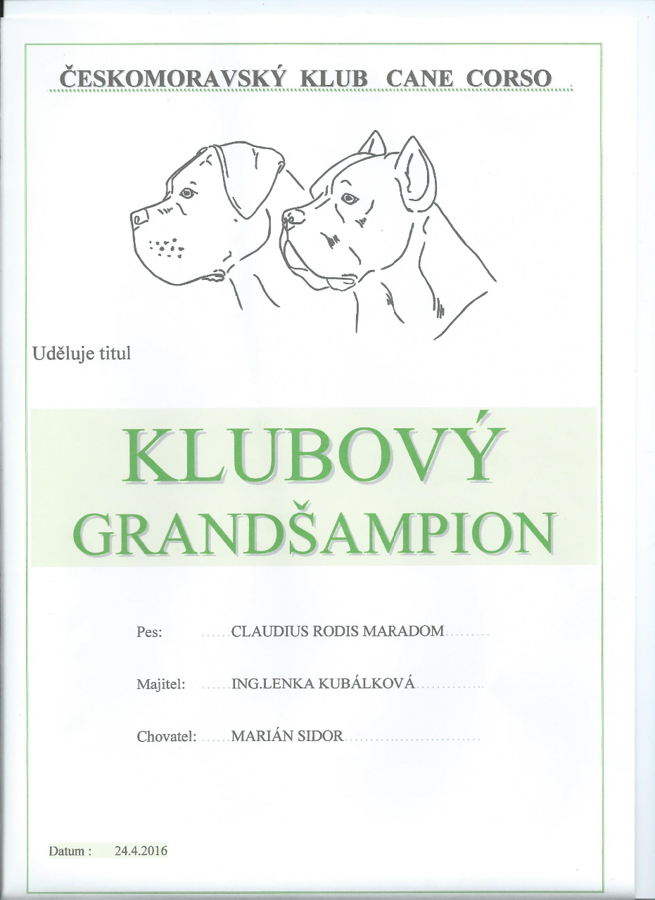 Dne 24. 4. 2016 byl Claudiusovi udělen a dne 27. 8. 2016 předán na Klubové výstavě ČMKCC titul Klubový grandšampion.
